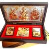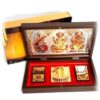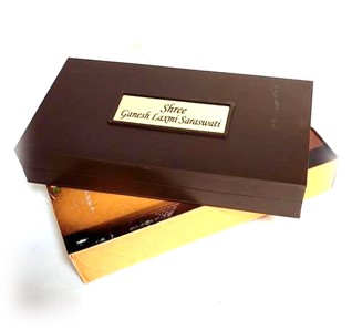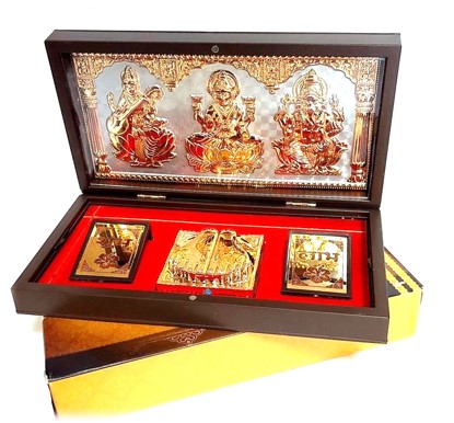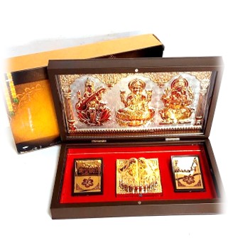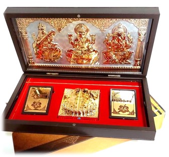 Three Deities divine box of Laxmi Lord Ganesha and Goddess saraswati in a nice gift box. Enclosed creatively inside a robust plastic rasin box. Box is Foldable with dual hinges and magnetic locking. Aunique and creative design.